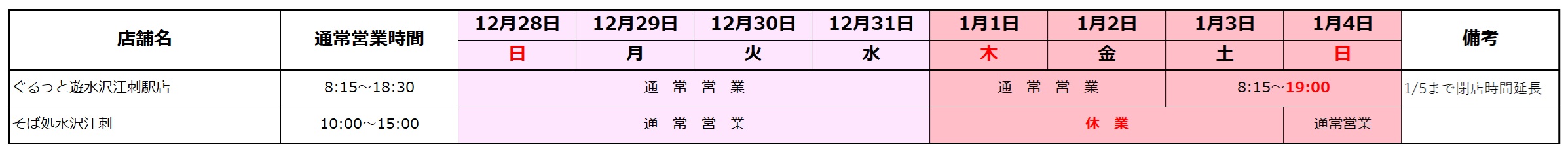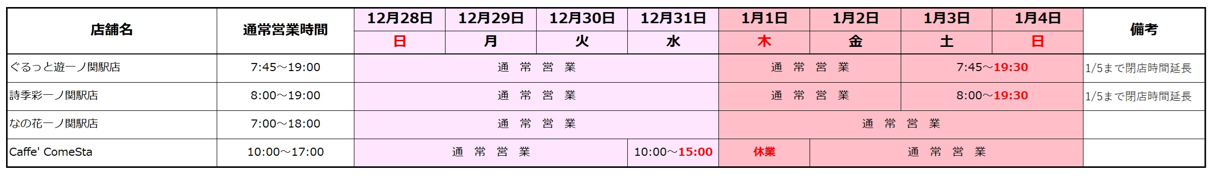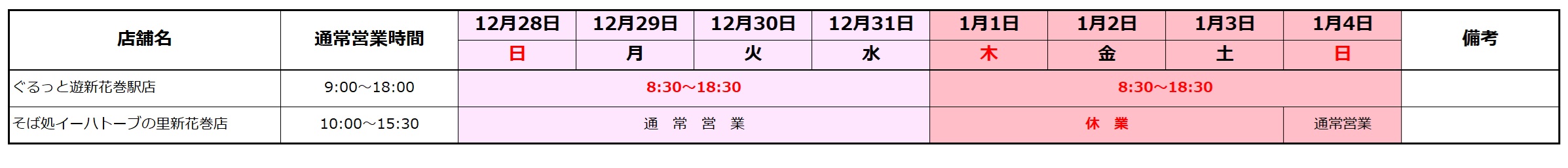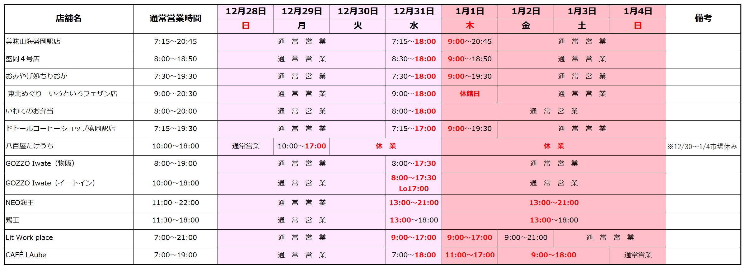岩手県内一部店舗における、年末年始の営業時間は下記のとおりです。皆様のご来店、心よりお待ちしております。※営業時間については予告なく変更する場合があります。