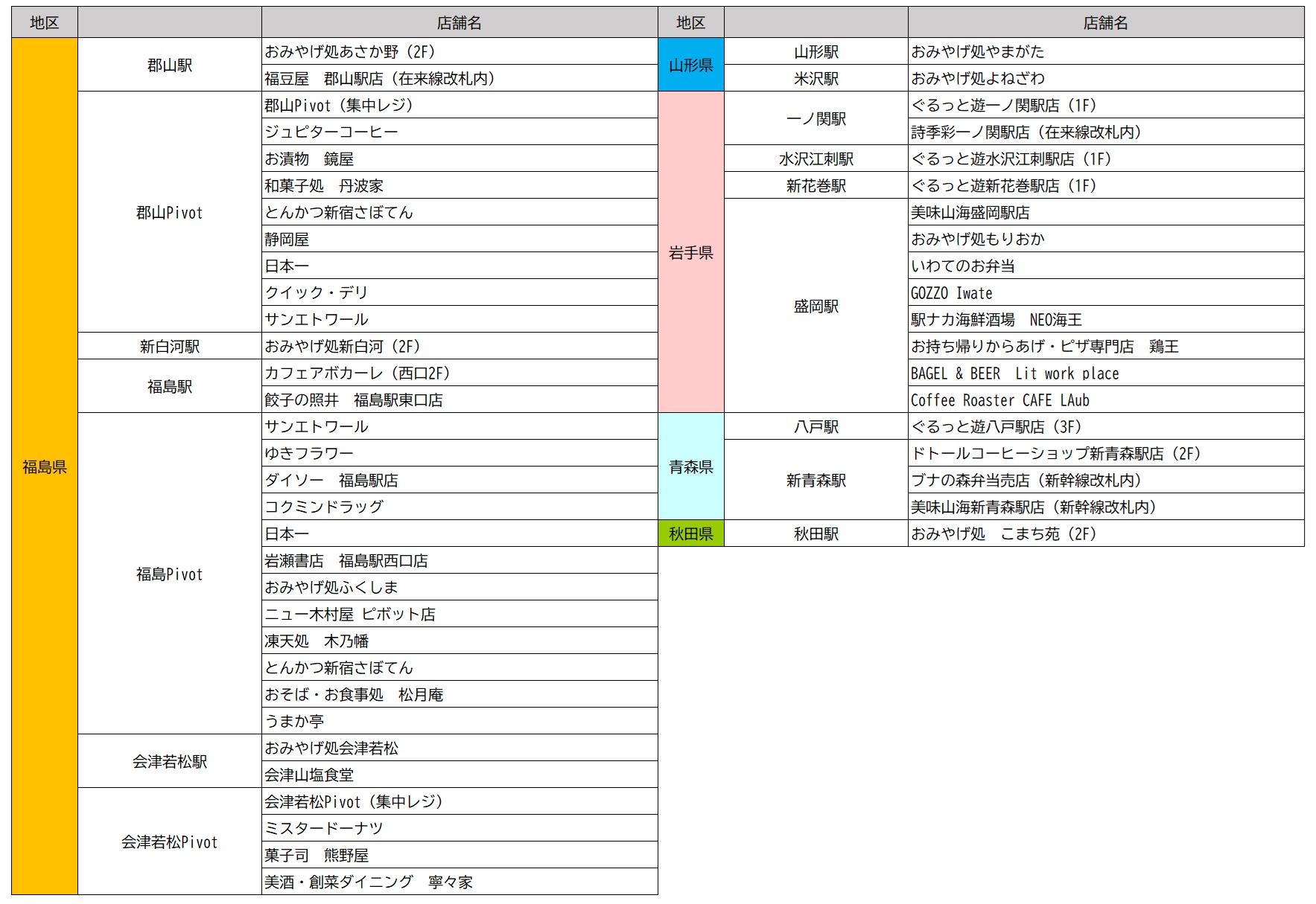 東北6県のエキナカ、Pivot各館、tekute各館の対象JRE POINT加盟店