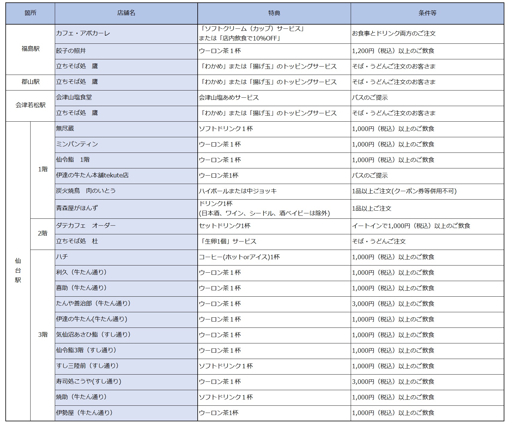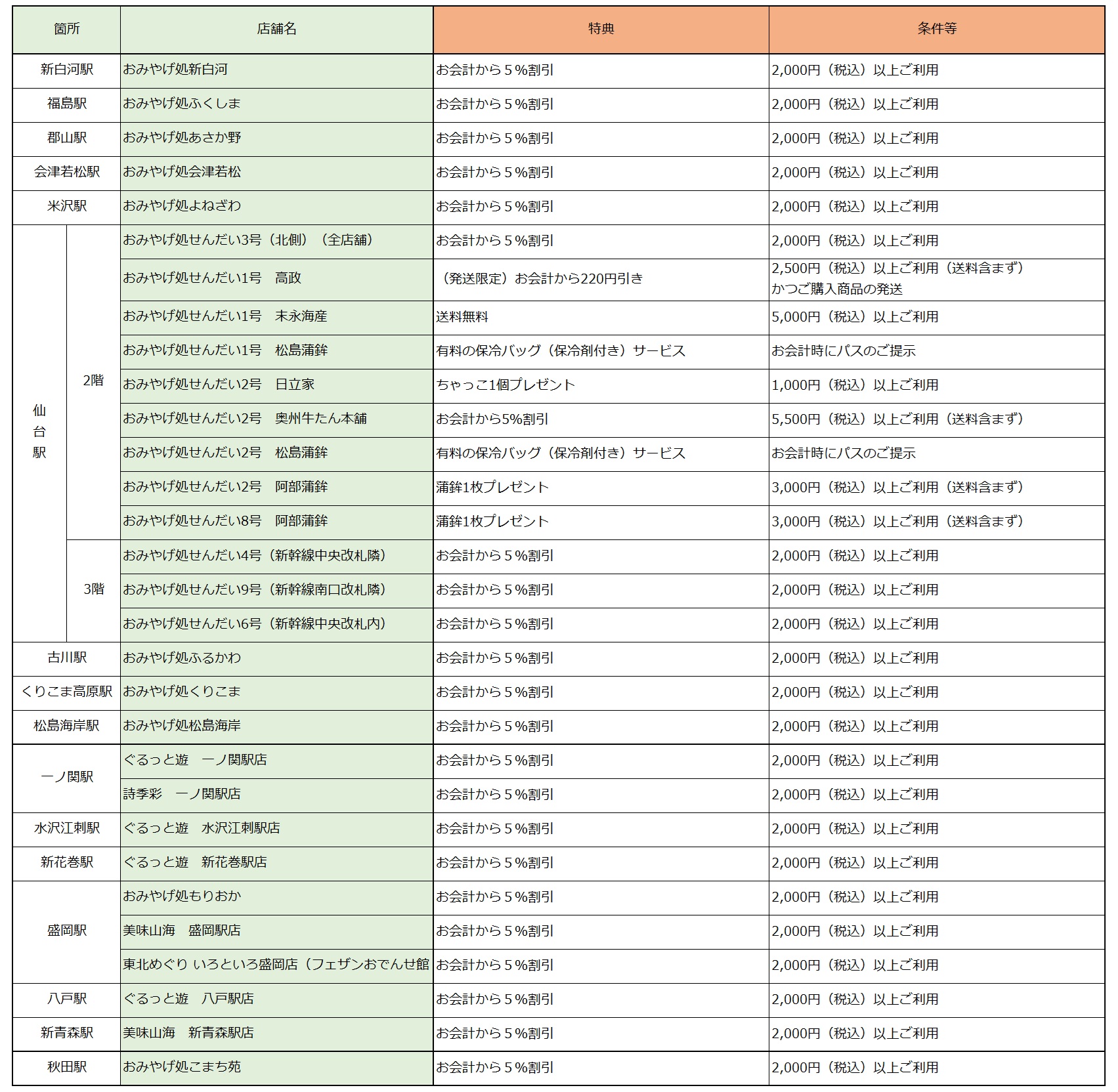 新青森駅、八戸駅、秋田駅、盛岡駅、新花巻駅、水沢江刺駅、一ノ関駅、米沢駅、仙台駅、くりこま高原駅、古川駅、松島海岸駅、福島駅、郡山駅、新白河駅、会津若松駅