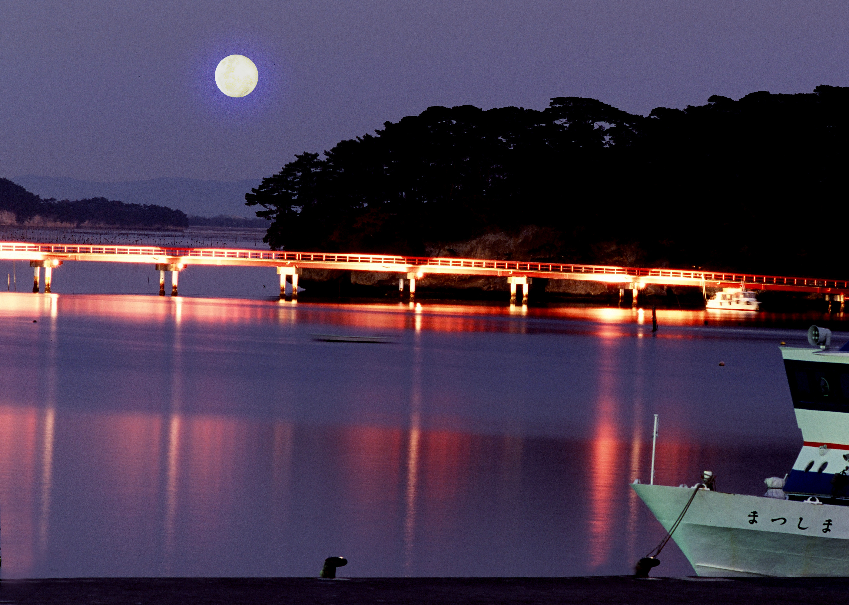 松島海岸の東に浮かぶ福浦島。全長252mの鮮やかな朱塗りの福浦橋(出会い橋)で有名。島内からは観光桟橋から見えない島々が望めます。遊歩道も設けられた自然公園となっており絶好の散策コースです。また、弁財天や縄文時代の貝塚などの歴史ある史跡も残されています。