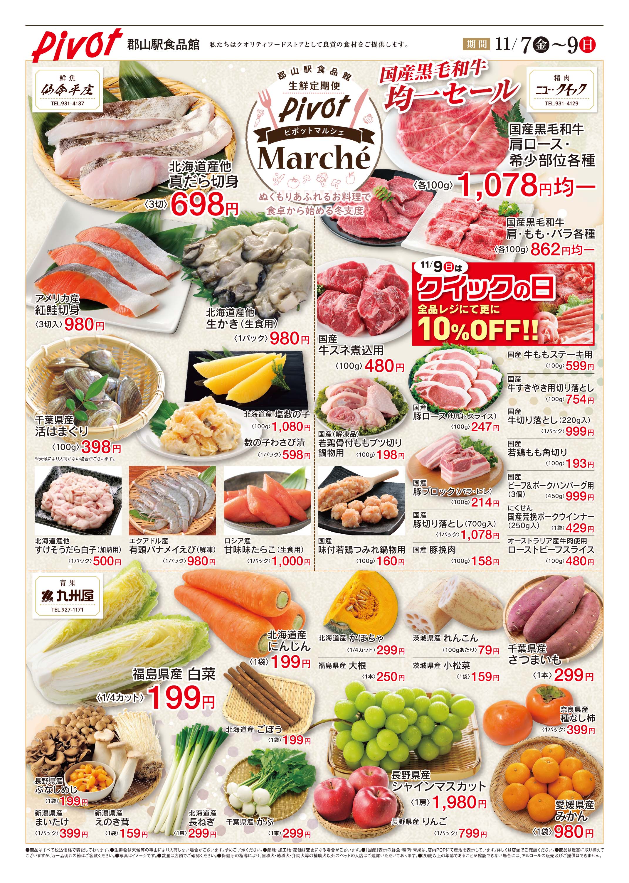 ●営業時間:10:00~20:00(一部店舗を除く)●電話番号:024-931-2554●駐車場 :あり(店舗利用で無料サービス有)☆施設情報詳細はこちら(トップページ)→ 検索結果 検索条件: 検索条件: 郡山店 ニュース・イベント 検索条件のクリア 郡山駅 ニュース・イベント ピボット郡山店チラシ ◇郡山駅食品館Pivot ◇【開催期間】2025/11/7(金)~11/9(日)「ピボットマルシェ」◎ぬくもりあふれるお料理で食卓から冬支度を始めませんか♪◎グロッサリーは「京都特集」を開催!京都ならではの食文化をご堪能ください!皆さまのお越しをお待ちしております。★ピボットチラシ(pdf)はこちら→