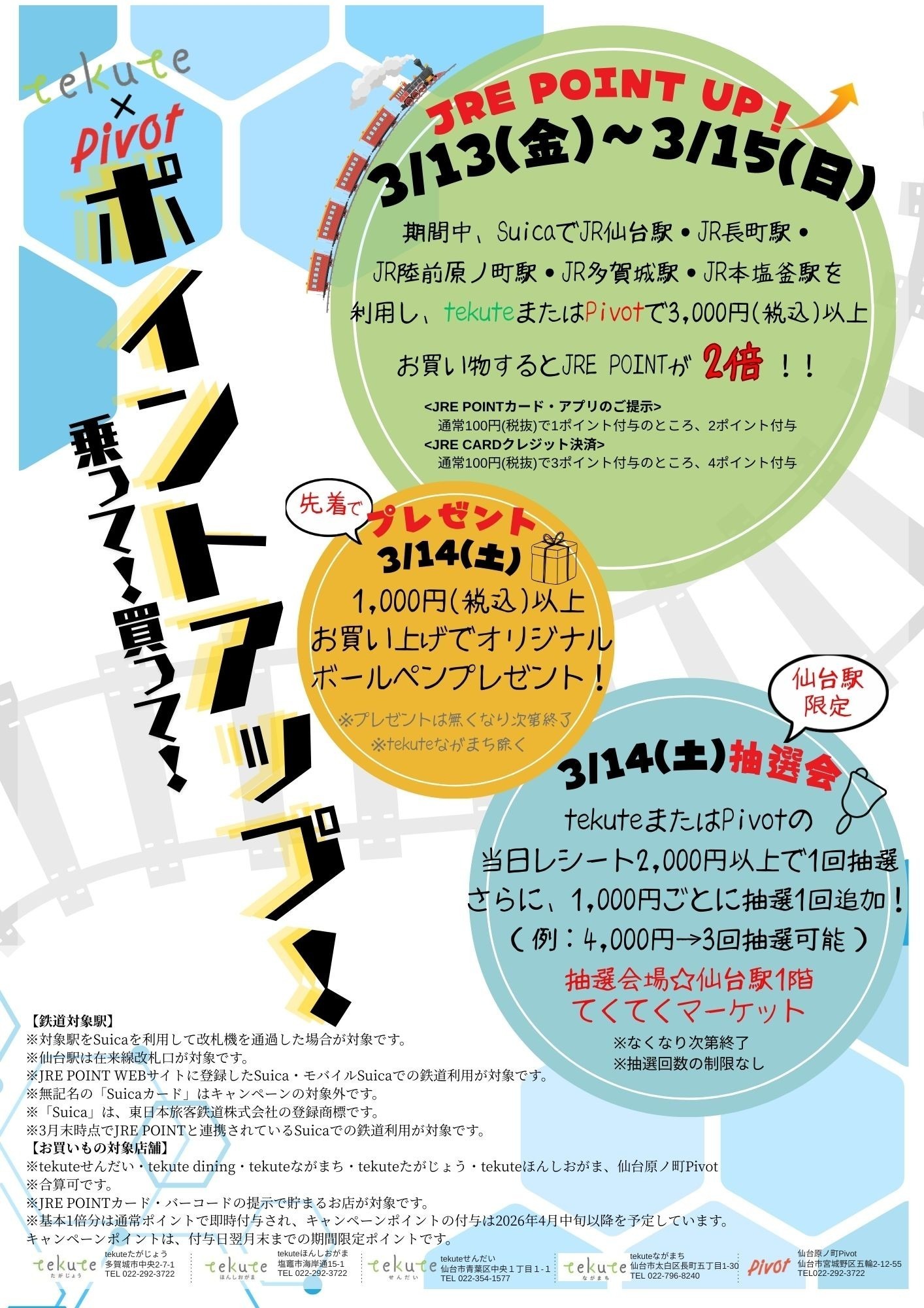 期間中、JRE POINT WEBサイトに登録したSuicaで対象駅を鉄道利用し、tekuteまたはPivotで3,000円(税込)以上お買い物するとJRE POINTが2倍!